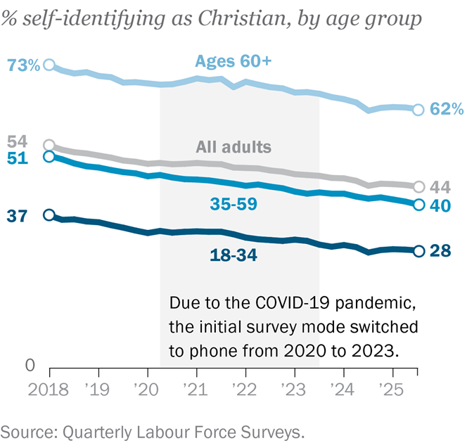There is also evidence from high-quality official surveys with very large samples. Analysis of the Labour Force Survey by the Pew Research Center shows Christian identity in Britain continuing to decline across all age groups.
