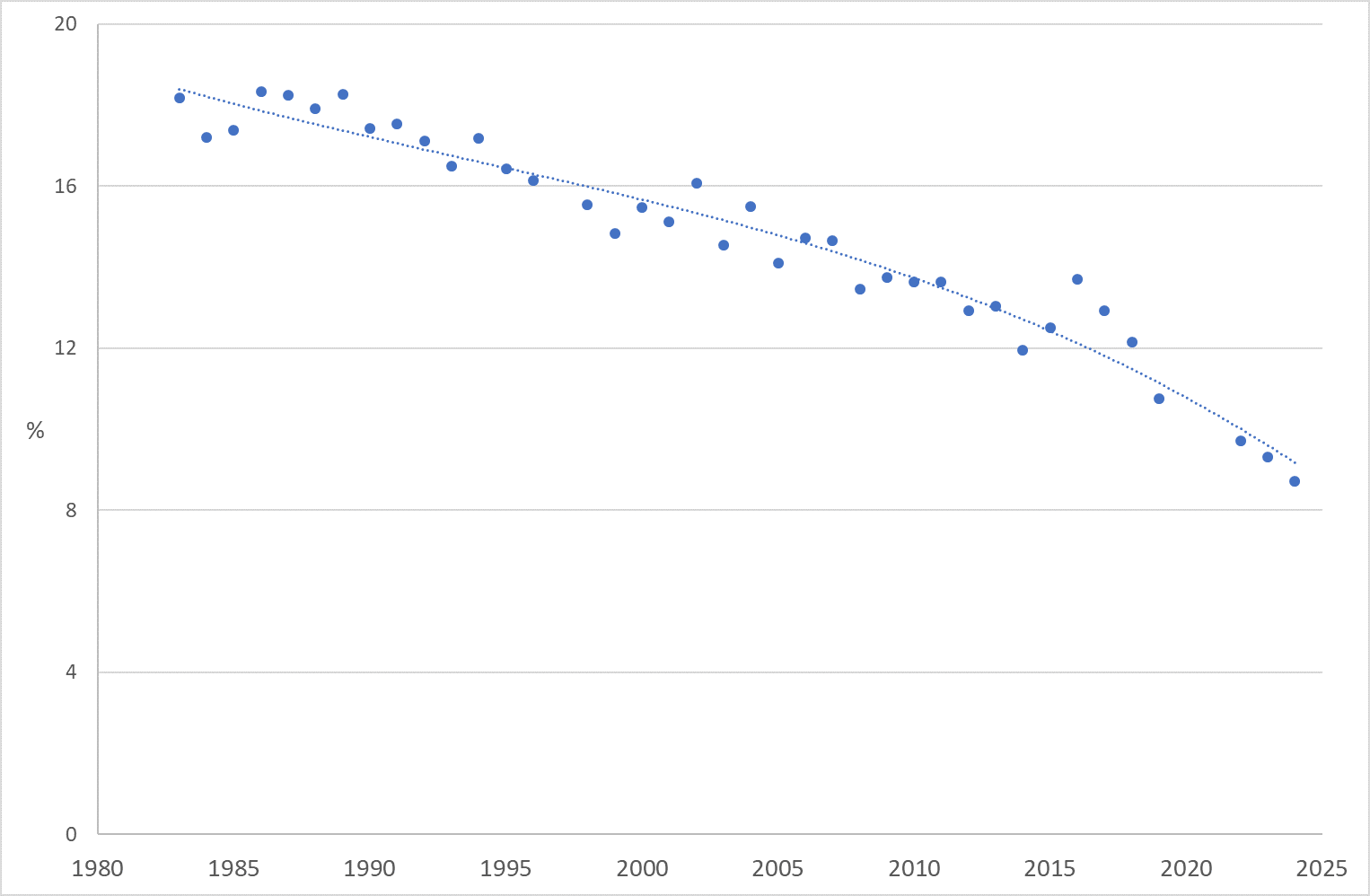 The key measure used by the Bible Society is the percentage of the adult population of England and Wales who say that they are Christian and attend church monthly or more often. The graph below shows the complete run of those values from the British Social Attitudes survey, 1983-2024 (omitting the pandemic years of 2020 and 2021):