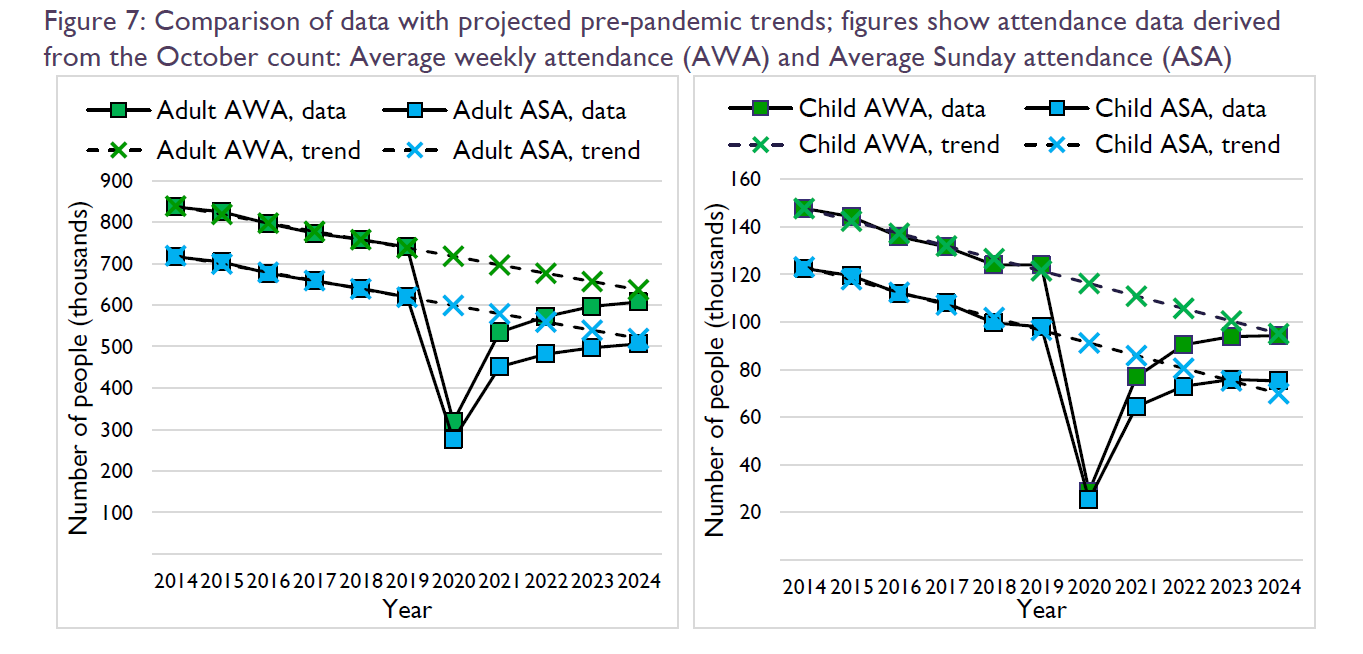 The C of E report shows graphs of adult and child attendance counts compared to an extrapolation of the pre-pandemic trends (in dashes). The description in the text is as follows: “Figure 7 shows recent October attendance data alongside projected pre-pandemic trends. These trends are not telling us what would have happened if there had not been a pandemic; instead, they show what would had happened if the pre-pandemic trends (from 2014 to 2019) had continued. Adult attendance in 2024 was below its 2019 levels, and remained below the projected pre-pandemic trend. Child attendance in 2024 was close to or above the projected pre-pandemic trend.” (Statistics for Mission 2024, page 14).